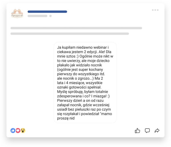 i przy wpadkach. Pomogę przygotować mieszkanie, auto i wszystkich opiekunów dziecka. Krok po kroku zaprezentuję plan działania w pierwszych dniach nauki korzystania z nocnika. Nie będziesz musiała_musiał, szukać porad i rozwiązań w sieci - cały proces masz w jednym miejscu.